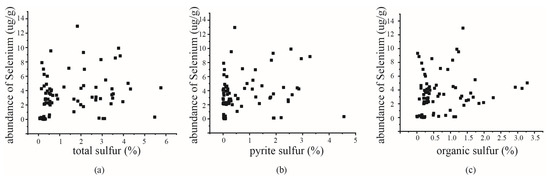Since the sulfate sulfur (Ss, d) content in the coal was very low, this study investigated the correlation between selenium and total sulfur, pyrite sulfur (Sp, d) and organic sulfur (So, d) in 81 coal samples. The results showed that there existed no obvious correlation between selenium in the coal and the total sulfur, pyrite sulfur (Sp, d) and organic sulfur (So, d) (Figure 7), which is different from the results obtained by most scholars. The difference in conclusions is mainly attributed to the fact that previous studies chose a particular mining area or coal basin as their research area, but the coal samples in this study came from 14 major coal-producing provinces in China, of which there are great differences in terms of the coal-forming environment, coal-forming age, type of coal rock, horizons, sulfur concentration (0.06%–5.76%) and selenium concentration (0.00–12.97 μg/g) [3,49,51,53,54,55].