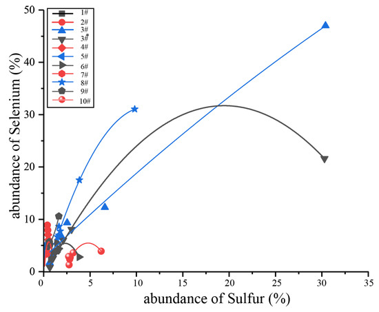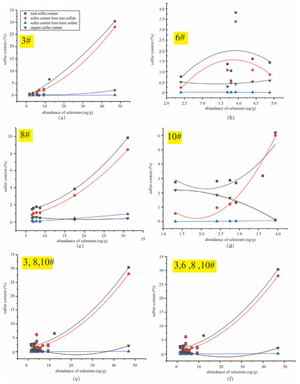 The 10# coal was rich in sulfur but only had a Se concentration of 2.46 μg/g. The correlation between Selenium and total sulfur, pyrite sulfur, sulfate sulfur and organic sulfur was also observed in the 10# coal, but the coefficients were different from those of the 3# and 8# coal. Selenium was positively correlated with the total sulfur, pyrite sulfur and sulfate sulfur. Among them, selenium showed the most significant positive correlation with sulfate sulfur (R2 = 0.9952), followed by pyrite sulfur (R2 = 0.9875) and the total sulfur (R2 = 0.7496). Selenium was significantly and negatively correlated with organic sulfur, with a negative correlation coefficient of 0.9965. The 6# coal was a medium–high-sulfur coal, and selenium showed no correlation with the total sulfur, pyrite sulfur and sulfate sulfur, and a negative correlation with organic sulfur (R2 = 0.6924).