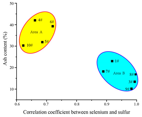 Further analysis of the 10 floating coal samples found that the 2# coal sample was an abnormal sample because of its unusually high ash content (Ad = 51.92%); among the remaining nine floating coal samples, the coal samples with lower correlation coefficients of selenium and sulfur were the coal samples with large ash in Area A (except for coal sample 2#), while the coal samples with higher correlation coefficients of selenium and sulfur were the coal samples with low ash in Area B (Figure 9).
