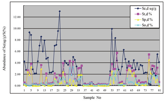 Sulfur occurs in three forms in coal: pyrite sulfur (Sp, d), sulfate sulfur (Ss, d) and organic sulfur (So, d). In order to discover which form of sulfur is more closely related to Se in coal, 81 coal samples were selected to test the occurrence forms of sulfur. The comprehensive analysis of selenium with the total sulfur and forms of sulfur is shown in Figure 10. Because the 81 coal samples came from different regions with different coal types and sedimentary environments, the content of sulfur and Se in coal varies greatly, and the two are not comparable. However, from the overall view of Figure 10, the Se content was proportional to the sulfur content in the coal, and a more positive correlation was observed between selenium and pyrite sulfur while a less positive correlation was observed between selenium and organic sulfur.
