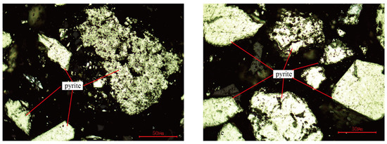 To further study the correlation between Se and pyrite, a part of the 138 raw coal samples with an obviously different Se abundance (Se, d, 0.72–12.97 μg/g) and the 3# floating coal with a density grade >2.0 (Se, d = 21.6 μg/g) were selected to conduct a coal petrology analysis using a LEICA multifunctional optical microscope. The Se abundance of the raw coal samples with generally similar total organic matter (80%–90%) varied greatly from 0.72μg/g to 12.97 μg/g, implying that the organic matter was not very correlated with Se. Overall, the more pyrite content in the raw coal samples, the higher the Se abundance. Especially for the 3# floating coal with a density grade >2.0, the extremely Se-rich floating coal was also enriched with extensive bulk and granular pyrite. The mass pyrite was observed under a microscope, which had a massive form and different grain sizes and shapes (Figure 12). Accordingly, the enrichment of pyrite during flotation was probably responsible for the enrichment of Se. Although Se was closely correlated with pyrite in the coal, the Se abundance was not strictly proportional to the pyrite content (Table 10), which may be attributed to the following reasons: (1) The occurrence (e.g., whether it is massive, small and granular, a berry ball, filled within a cell cavity or fissure) and genesis of pyrite (e.g., biogenetic, nonbiogenetic) is very complicated in coal [67]. (2) The occurrence (e.g., whether it is water soluble, exchangeable, alkali soluble, elemental, acid soluble, sulfur/selenide binding and a residue) and genesis (e.g., biogenetic, nonbiogenetic) of Se is also very complicated in coal [68]. (3) The total Se abundance is not strictly proportional to the total pyrite content, probably because certain occurrences of pyrites are responsible for the dominant Se; in other words, Se is not uniformly distributed in pyrite. Our further microanalysis on the 3# floating coal with a density grade >2.0 using the field emission electron probe microanalyzer (SHIMADZU, EPMA-8050G) discovered the local enrichment of selenium in the pyrite particles, but the enrichment regularity of selenium in pyrite was not discovered yet, which further validates the correlation between selenium and pyrite sulfur proposed by previous studies [28,30,31] as well as the uneven distribution of Se in pyrite. The preliminary SHIMADZU analysis still needs to be studied with different occurrence of Se and pyrite.