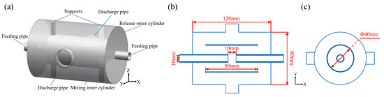 This investigation was performed using a laboratory colliding flow pulp conditioning device (CFPCD), and the schematic of CFPCD is shown in Figure 1. It consists of four components: (a) a release outer cylinder of 80 mm diameter and 120 mm length, (b) a mixing inner cylinder of 40 mm diameter and 80 mm length, (c) two feeding pipes of 10 mm diameter, and (d) two discharge pipes of 25 mm diameter. Two feeding pipes are in an opposite direction, and the distance between them is 10 mm. The mixing inner cylinder is a hollow cylinder with two open ends, which is fixed in the release outer cylinder with four supports. The discharge pipe is symmetrically arranged on the side of the outer cylinder. In pulp conditioning process, the pulp is fed into the mixing inner cylinder from the feeding pipes using two feeding pumps, respectively. The colliding flow is formed to cause intense turbulence and cross shear forces, promoting the mixing and interaction between particles and collector. Subsequently, the mixed pulp flows through the openings on both ends of the inner cylinder into the outer cylinder, and is released through the discharge pipe.
