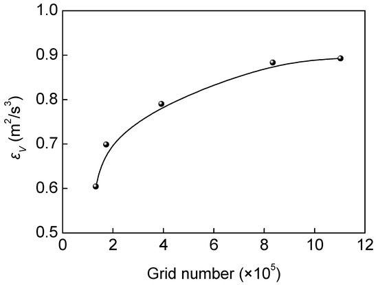 The 3D model was constructed using UG NX 10.0 software based on the structure shown in Figure 1. Subsequently, the above model was meshed using the ANSYS ICEM 17.0 software, and the hexahedral structured grid was generated. The volume-averaged turbulent dissipation rate (εV) was considered as the characteristic parameter to carry out the grid independence verification. The results of grid independence verification are shown in Figure 2. As observed, the value of εV increased with an increase in the number of grids until the number of grids reached 834072, after which it tended to be stable. By considering both the calculation accuracy and cost, meshing strategy with 834,072 grids was selected for the present study.