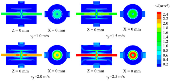 Velocity nephograms of the CFPCD at Z = 0 mm and X = 0 mm section.
