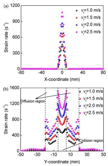 Strain rate distributions of the CFPCD at various lines: (a) line (Y = 0 mm, Z = 0 mm) and (b) line (X = 0 mm, Z = 0 mm).