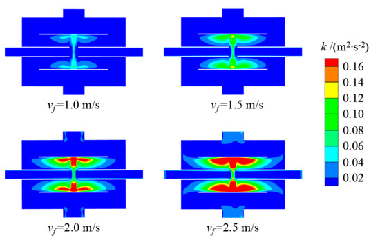 Turbulent kinetic energy nephograms of CFPCD for different feeding velocities.