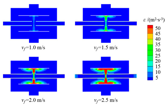 Turbulent dissipation rate nephograms of the CFPCD for different feeding velocities.