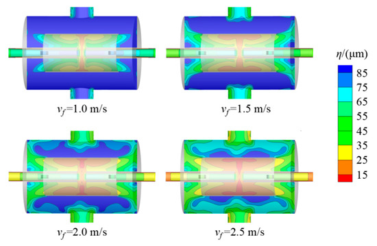 The Kolmogorov scale distributions of the CFPCD for different feeding velocities were shown in Figure 7. In each studied feeding velocity, the low Kolmogorov scale was mainly distributed in the diffusion region after fluid collision and near the inner wall of the inner cylinder. In the study range, the Kolmogorov scale generated in these regions was less than 25 μm at any feeding velocity. These eddies with a scale comparable to the fine particles were more conducive to promoting the interaction between the fine particles and the collector droplets, which enhanced the pulp conditioning process. This indicated that the CFPCD can produce the good pulp conditioning effect for particles. In the release outer cylinder, the eddy scale was generally large, which was conducive to the transportation and mixing of the pulp. The low Kolmogorov scale distribution range increased with the increasing feeding velocity. As the feeding velocity reached 2.5 m/s, the Kolmogorov scale in the entire mixing inner cylinder was almost below 25 μm, and even reached 15 μm in some regions. Additionally, an increase in the feeding velocity could reduce the average Kolmogorov scale within the CFPCD.