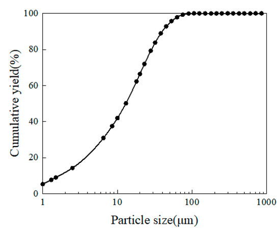 The coal gasification fine slag contained various constituents, wherein the carbon and ash components were intimately associated. Therefore, dissociation was usually required before the flotation separation. In this study, the dissociation was carried out using a rod mill. In the dissociation process, 240 g of samples were put into a rod mill and ground at 50 Hz frequency for 15 min to disassociate carbon and ash. A BT-9300 Laser Particle Sizer (DanDong Bettersize, Dandong, China) was used to measure the particle size distribution of the sample after grinding and the result was shown in Figure 9. The D10, D50, and D90 were approximately 1.66 μm, 12.95 μm, and 39.76 μm, respectively. Obviously, the content of fine particles in the sample was high, which was the main object of subsequent conditioning-flotation.