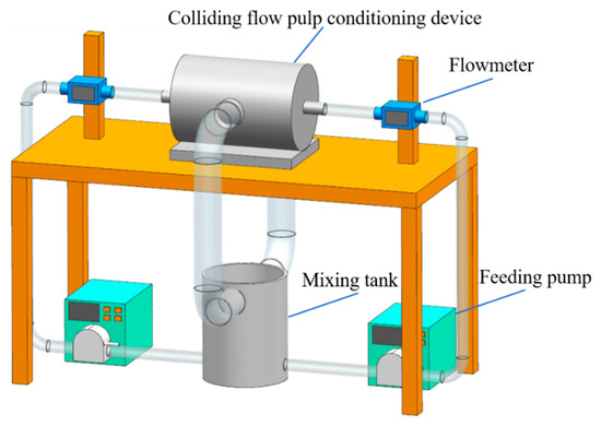 The pulp conditioning tests were conducted using a laboratory CFPCD, and the schematic layout of the experimental setup was shown in Figure 10. Coal gasification fine slag samples after grinding and deionized water were added into a mixing tank to prepare pulp with a concentration of 80 g/L. The diesel oil with a dose of 8000 g/t sample and methyl isobutyl methanol with a dose of 8000 g/t sample were subsequently added into the pulp in the mixing tank, respectively. The mixing pulp was fed into the CFPCD using two feeding pumps, and the feeding velocity were adjusted to 1.0, 1.5, 2.0, and 2.5 m/s, respectively. Besides, the conditioning time was constant at 2 min. Finally, the conditioned pulp was collected and prepared for subsequent experiments.