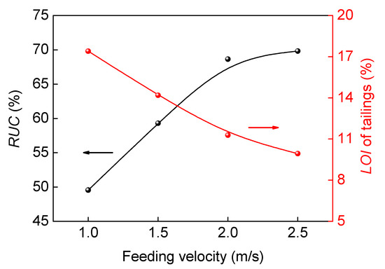 The flotation results after pulp conditioning for different feeding velocities were shown in Table 2 and Figure 12 (The black arrow represents the black line data being read out on the left axis and the red arrow represents the red line data being read out on the right axis). As observed, the ash content of tailings increased from 82.60% to 90.06% and the RUC increased from 49.57% to 69.83% with the feeding velocity increased from 1.0 m/s to 2.5 m/s. Meanwhile, the LOI of tailings decreased from 17.40% to 9.94%. These results were consistent with the previous flow field simulation and wrap angle analysis. The increase in feeding velocity brought about the increase in velocity gradient and strain rate, and the decrease in turbulent eddy scale, which was beneficial for enhancing the interaction between mineral particles and collector droplets. Therefore, the recovery efficiency of carbon component was improved. This indicated that the colliding flow enhanced the flotation process of coal gasification slag, and the feeding velocity of CFPCD significantly affected the removal performance of unburned carbon. In the study range, the optimum feeding velocity was 2.5 m/s, and the corresponding LOI indicators of flotation tailings products may meet the quality requirements of some mixed mortar and concrete.