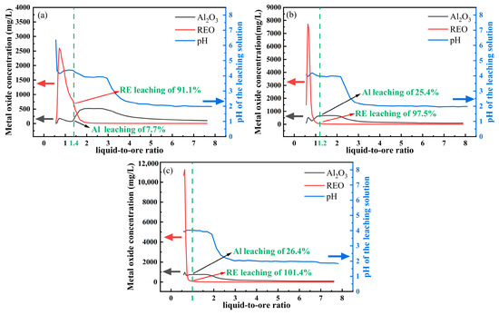 Figure 3), at a liquid-to-ore ratio of 1.4 and magnesium sulfate concentration of 0.5 wt.%, the leaching rate of rare earths increased from 76.2% to 91.0% as pH decreased from 5 to 2, while the leaching rate of aluminum increased from 5.9% to 7.7%. However, at a liquid-to-solid ratio of 1 and magnesium sulfate concentration of 4 wt.%, the leaching rate of rare earths increased from 94.1% to 101.4%, and the leaching rate of aluminum increased from 11.1% to 26.4%. When the magnesium sulfate concentration was low, decreasing the pH of the leaching agent significantly increased the leaching rate of rare earths but had no significant effect on the leaching rate of aluminum. When the magnesium sulfate concentration was high, decreasing the pH of the leaching agent slightly increased the leaching rate of rare earths but significantly increased the leaching rate of aluminum. Therefore, it is necessary to further study the occurrence transition and migration of aluminum during the leaching process to regulate the leaching behavior of aluminum and improve the leaching of rare earths while reducing the leaching of aluminum.
