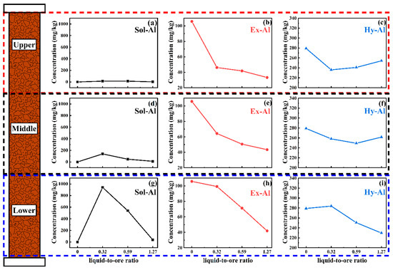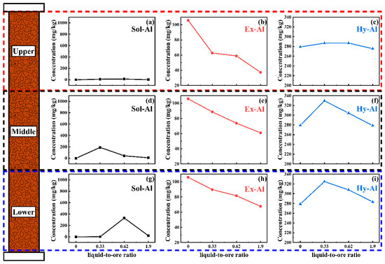 Figure 5, when the pH of the leaching agent was controlled at 5 and the concentration of magnesium sulfate increased to 4 wt.%, the peaks of the Sol-Al, Ex-Al, and Hy-Al contents of the entire ore column moved to lower liquid-to-ore ratios, indicating that when the pH of leaching agent was 5, the increase of magnesium sulfate concentration could promote the transition of Ex-Al to Sol-Al and the transition of Sol-Al to Hy-Al in the column leaching as well as accelerate the elution of Sol-Al.
