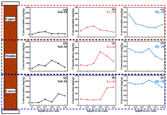 When the liquid-to-ore ratio increased to 2.46, the Sol-Al, Ex-Al and Hy-Al content in the middle and lower parts all decreased, indicating the occurrence transition of Hy-Al and Ex-Al to Sol-Al and continuous elution of Sol-Al at this stage.