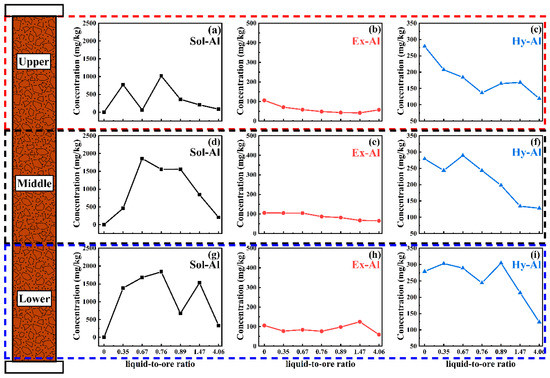 With the increase in the liquid-to-ore ratio (0.67–1.67), Sol-Al continued to migrate downward, and the back-adsorption area of aluminum gradually moved from the upper part to the middle and lower parts. In addition, there were peaks of Sol-Al, Ex-Al, and Hy-Al content in the middle and lower parts, respectively. The peaks of Sol-Al, Ex-Al, and Hy-Al content in the middle part were 753 mg/kg, 330 mg/kg, and 279 mg/kg, respectively, and the liquid-to-ore ratio corresponding to the peaks was 1.09. The peaks of the Sol-Al, Ex-Al, and Hy-Al content in the lower part were 817 mg/kg, 293 mg/kg, and 269 mg/kg, respectively, and the liquid-to-ore ratio corresponding to the peaks was 1.67. This means that the occurrence transition of Sol-Al to Ex-Al and Hy-Al occurred in the middle and lower parts at this stage. The leaching curve in