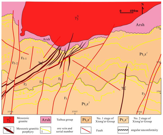 The deposit’s structures are dominated by faults that strike in three directions (NE–NNE, EW, and NW). The majority of the faults strike in the NE–NNE and EW directions. A few faults strike NW and crosscut the NE-trending faults and veins. The NE–NNE-trending faults dip at 70–80° and represent the channel through which hydrothermal fluids have circulated [26]. The EW-trending faults have developed along the interlayer interfaces of the Xiong’er Group and dip at 20–45°, and they contain the ore bodies. The Huashan intrusion, a Yanshanian granite, is an outcrop with an ellipsoidal shape in the northern part. Many NE–NNE-trending dykes of syenogranite porphyry intercalate the Xiong’er Group, causing slight displacement of the gold-bearing veins (Figure 2).