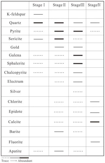 On the basis of its paragenetic sequence and mineral assemblage (Figure 3), the Luyuangou gold deposit is divided into four mineralization stages: the milky quartz stage (Stage I), the quartz + pyrite stage (Stage II), the quartz + polymetallic sulfide stage (Stage III), and the quartz + calcite stage (Stage IV) (Figure 4, Figure 5 and Figure 6). Stage I is characterized by coarse-grained cubic pyrite in milky quartz veins (Figure 4a and Figure 5c). Stage II is fine-grained pyrite disseminated in altered rocks (Figure 4b,d). Stage III is identified by polymetallic sulfide veins (such as pyrite, sphalerite, galena, and chalcopyrite) crosscutting Stage I and Stage II (Figure 4c,d). Stage IV is characterized by quartz and calcite veins cutting through Stages I, II, and III (Figure 4d). Stages II and III are the major metallogenic stages.