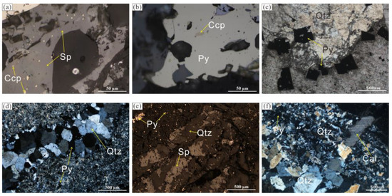 Representative micrographs of the ore in the Luyuangou gold deposit. (a) Chalcopyrite is enclaved in sphalerite (reflected light). (b) Chalcopyrite is enclaved in pyrite (reflected light). (c) Coarse-grained quartz and euhedral pyrite. (d) Quartz–pyrite veins crosscutting through the altered rock. (e) Quartz sulfide veins crosscutting through the pyritized altered rocks (reflected light). (f) A quartz pyrite vein (Ⅱ) is crosscut by a quartz calcite vein (Ⅳ). Ccp, chalcopyrite; Qtz, quartz; Py, pyrite; Sp, sphalerite; Cal, calcite.