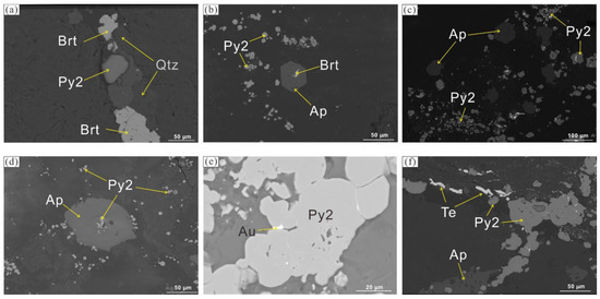 Representative backscattered electron (BSE) images of the ore in the Luyuangou gold deposit. (a) Barite in a quartz pyrite vein (Ⅱ). (b) Barite enclaved in apatite. (c) Apatite in a quartz pyrite vein (Ⅱ). (d) Pyrite enclaved in apatite. (e) Gold occurring in the cracks of pyrite. (f) Tellurium in a quartz pyrite vein (Ⅱ). Qtz, quartz; Py, pyrite; Brt, barite; Ap, apatite; Te, tellurium; Au, gold.