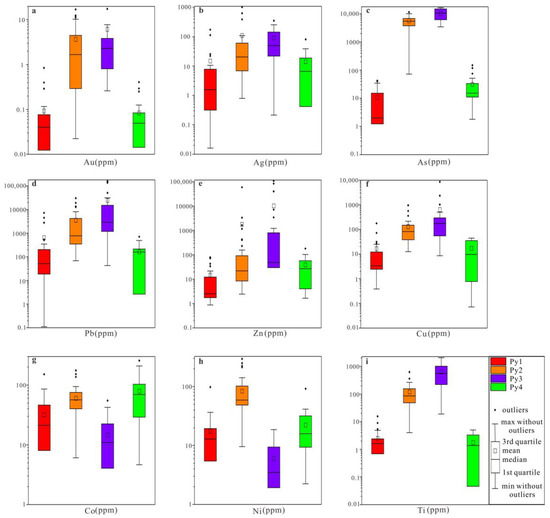 Box plots of the concentrations of trace elements for each pyrite type from the Luyuangou gold deposit. (a) Concentrations of Au elements of pyrite from different generations. (b) Concentrations of Ag elements of pyrite from different generations. (c) Concentrations of As elements of pyrite from different generations. (d) Concentrations of Pb elements of pyrite from different generations. (e) Concentrations of Zn elements of pyrite from different generations. (f) Concentrations of Cu elements of pyrite from different generations. (g) Concentrations of Co elements of pyrite from different generations. (h) Concentrations of Ni elements of pyrite from different generations. (i) Concentrations of Ti elements of pyrite from different generations.