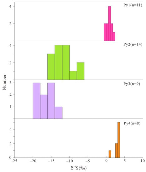 - The δ34S values of Py1 ranged from −0.3 to 1.9‰, indicating a magmatic origin. The δ34S values of Py2 and Py3 ranged from −15.4 to −6.1‰ and −19.5 to −12.4‰, respectively, indicating an origin from oxidizing fluids. The δ34S values of Py4 ranged from 1.1 to 3.4‰, indicating that the S originated from host rocks under the action of meteoric water cycles.