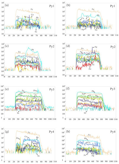 Trace elements such as Co, Ni, As, Se, and Sb are commonly distributed in pyrite. Cobalt and Ni can replace Fe through isomorphism, while As, Se, and Sb can replace S to enter the pyrite lattice. In the LA-ICP-MS time-resolved depth profiles, most samples showed flat signal patterns for the elements Co, Ni, and As, consistent with Fe (Figure 10), suggesting that these elements appeared in the pyrite lattice through isomorphism [45]. However, the presence of “peaks” in some samples indicated that some of these elements were also present as micro/nanomineral inclusions (Figure 10a,g) [44]. Copper, Pb, and Zn cannot enter the pyrite lattice by replacing Fe during the mineralization process. Therefore, these elements are usually present in pyrite as mineral inclusions (galena, sphalerite, and chalcopyrite) [46]. Lead and Zn showed abnormal concentrations in all four pyrite stages, with the content varying from below the detection line to several hundred thousand parts per million (Table S1). We suggest that Pb and Zn are distributed as mineral phases in Py1 and as micron/nanometer inclusions in Py2, Py3, and Py4, causing anomalies in the elemental content (Figure 10). Some samples with flat time-resolved depth profiles (Figure 10e, f, h) indicated that small amounts of Pb and Zn were also present in the pyrite lattice as solid solutions (Table S1).
