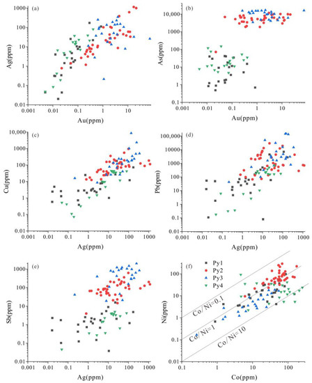 Binary plots of (a) Au vs. Ag, (b) Au vs. As, (c) Ag vs. Cu, (d) Ag vs. Pb, (e) Ag vs. Sb, and (f) Co vs. Ni in different stages of pyrite.