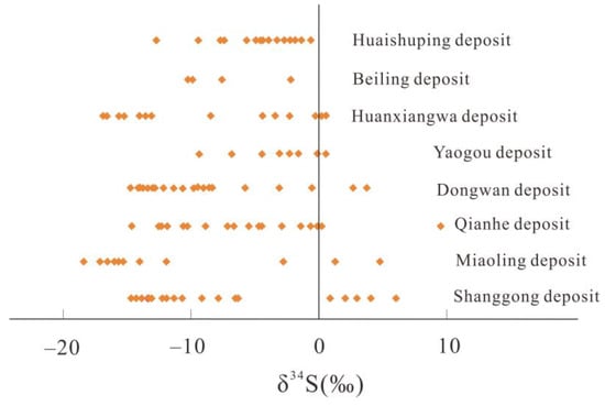 Characteristics of 34S distribution in pyrite of gold deposits in the XESPMD (modified from [58]).