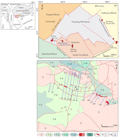 The Bainiuchang deposit is located in the southeast Yunnan metallogenic belt of the Cathaysian block, adjacent to the Yangtze block in the west and the Indosinian block in the south, at the junction of three tectonic units. It has experienced three stages of Caledonian, Indosinian and Yanshanian orogenesis, and the geological processes in the area are complex. Yanshanian granites formed around the periphery of the Youjiang rift basin around a number of large Sn polymetallic deposits, such as at Gejiu and Dachang (