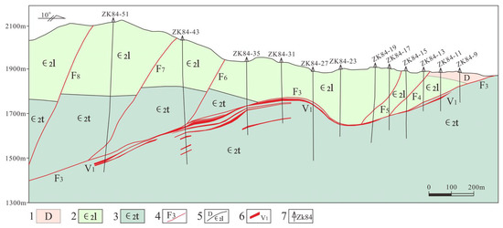 1 strikes 100° and dips 190° to the SW (with an angle of 15–20°), and has a strike length of 4.8 km, depth of dip up to 2.5 km (average = 1.31 km) and maximum thickness of 33.62 m (average = 5.65 m). The ore body occurs in the upper part of the middle Cambrian Tianpeng Formation near the F