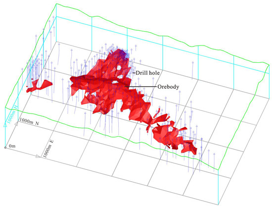 Table 1). After the data were entered into the 3Dmine software, the prospecting results and data were positioned and displayed in three dimensions. An ore body model was established with the cut-off grades of Ag = 40 ppm, Pb = 0.3 wt.%, Zn = 0.5 wt.%, Sn = 0.2 wt.% and Cu = 0.3 wt.% (