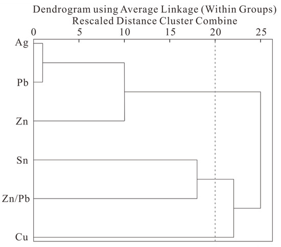 The correlation, cluster and factor analysis showed that Ag–Pb–Zn are close, this group of elements represents the medium-temperature ore-forming elements. The Ag-bearing minerals in this deposit are argentite, stephanite, pyrargyrite and jamesonite. It is assumed that these Ag-rich sulphides were syngenetic with galena and sphalerite, and that Ag–Pb–Zn precipitated from ore-forming fluid during the mesothermal stage to form polymetallic sulphide ores.