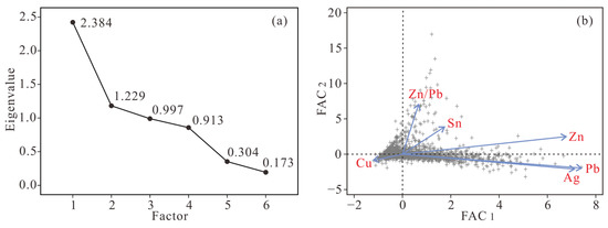 Trend surface analysis shows that the mineralization intensity of Ag, Pb, Zn, Cu and medium-temperature factor score FAC1 are weak in the south and strong in the north, while the mineralization intensity of Sn and high temperature factor score FAC2 are strong in the south and weak in the north. We hypothesize that the high-Zn/Pb zone in the south represents the source of the ore-forming fluid, which precipitated the high-temperature element Sn in the south, Cu in the center and the medium-temperature elements Ag–Pb–Zn in the north, as the ore-forming fluid migrated from south to north.