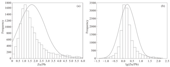 Figure 8. The lg(Zn/Pb) values are similar to a symmetrical distribution, and thus the lg(Zn/Pb) values were used for the semivariogram analysis.