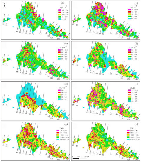 Figure 10f), and the high values commonly overlap those of Sn. The high Zn/Pb values are concentrated in two intervals (45–60 and 109–130), with good continuity along the strike and in the dip direction of the ore bodies. The concentration of the medium-temperature factor score FAC