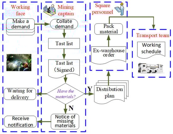 The material delivery process is shown in Figure 1. Working face to fill in the required material information submitted to take the mining captain for approval. Approval by the demand can be directly collated, approval does not pass the need to fill out the reasons for rejection. The working face checked the reasons for rejection and modified the material application form. After the modification was completed, the material application form was submitted to the mining captain for approval. Take the mining captain to audit all requirements after the formation of the task list and signed. The mining captain confirms whether the materials of the industrial square meet the requirements of the task list. When the materials in the industrial square meet the requirements of the task list, the distribution plan is formulated, and the working face waits for the delivery. The square personnel loads the materials into the standard container according to the Ex-warehouse order. After the loading is completed, the transport team transports according to the working schedule. When the material in the industrial square does not meet the requirements of the task list, the mining captain sends a material shortage notice to the working face, and the working face accepts the material shortage notice and modifies the application.