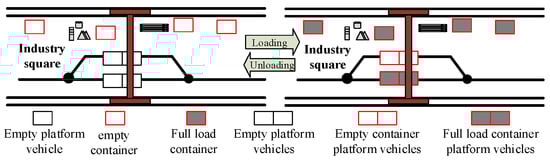 The material loading takes the intelligent loading vehicle of the industrial square as the starting point. The equipment layout of the industrial square is shown in Figure 2. In order to facilitate the loading and unloading of materials and standard containers, the transportation track is designed as a double track, with platform vehicles consisting of two platform vehicles. First of all, the square personnel puts the materials to be delivered according to the task list in advance, then the intelligent loading vehicle puts the materials into the empty standard container, and finally, the intelligent loading vehicle grabs the full standard container and fixes it on the empty platform vehicles after loading is completed by the transport robot in accordance with the planned route distribution. When the robot carries the empty standard container platform vehicles back, the intelligent loading vehicle grabs the empty standard container and puts it in the specified position.