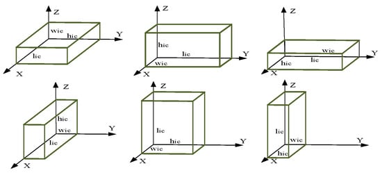The working face puts forward the material application according to the production demand, and forms i task list. The task list contains the basic characteristics of the material, and the material is loaded into the standard container according to the material characteristics. A three-dimensional rectangular coordinate system is established with the left, back, and bottom vertices of the standard container as the origin. The position decision variables represent the coordinate values of the left, rear, and lower vertices of the material c in the standard container k in the X, Y, and Z directions, respectively. Let () be the coordinates of another vertex of the body diagonal connected to the vertex, then the values can be calculated by the position decision variable and the relative length, width, and height, respectively. The materials are arranged in standard containers according to their length, width, and height {}. There are six orthogonal placements, represented by the direction number , as shown in Figure 4. The side of the material box parallel to the X-axis is relatively long, represented by ; correspondingly, the material box is parallel to the edges of the Y and Z axes, which are relatively wide and relatively high , respectively, as shown in Table 1.