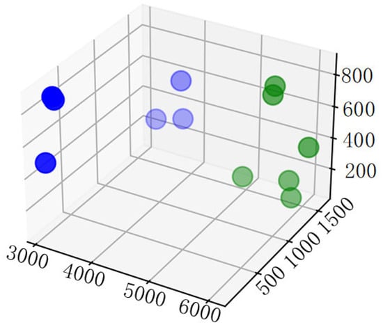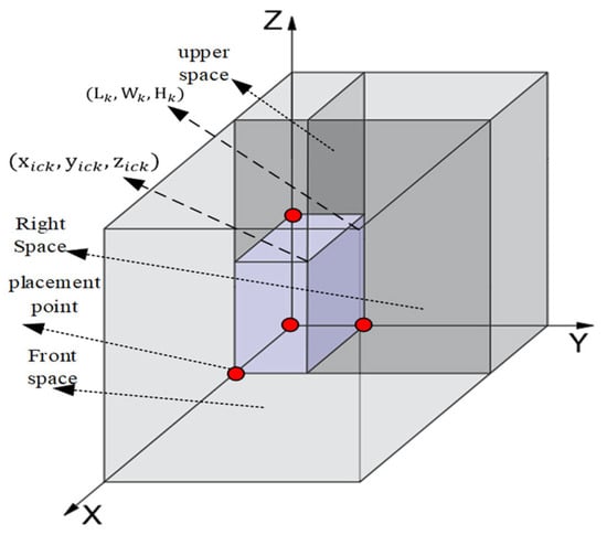 After placing a material container c of size into a standard container k of size , the available space of the standard container has three parts, front, right and top, as shown in Figure 5. The space coordinate of the kth standard container is set as , where (0,0,0) is the coordinate of the placement point, and is the space length, width, and height coordinates. After being placed in the container c, the three newly generated space coordinates are as follows: