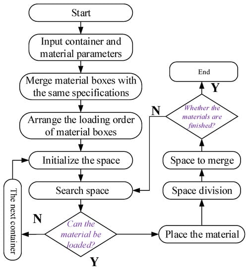 At present, the material loading method and loading sequence are mainly obtained by manual experience. This manual loading is often loaded one by one according to the materials on the loading list. The operation workload is large, the loading efficiency is low, the safety is low, and the space utilization rate of the standard container is low. Since the emergence of the cutting inventory problem in the 1960s, the solution to the three-dimensional loading problem has developed rapidly. Many researchers have proved that the hybrid genetic algorithm, heuristic method, and differential evolution (DE) algorithm can solve the heterogeneous material loading problem [1,2,3]. To increase the practicability of the loading algorithm, some scholars have studied the relationship between the constraints related to the box direction, load stability, and box separation, which greatly reduces the variables and constraints contained in the mathematical model and increases the solution efficiency [4,5,6]. Jamrus et al. [7] developed an extended priority-based hybrid genetic algorithm (EP-HGA) to determine the loading mode for the problem of transporting a small number of items that cannot fully utilize the container space. At present, most of the three-dimensional loading problems use heuristic algorithms to provide solutions, but most of the research focuses on single-container loading of strong heterogeneous items or multi-container loading of large-scale weak heterogeneous items, and there are few studies on three-dimensional loading algorithms for large-scale heterogeneous items.