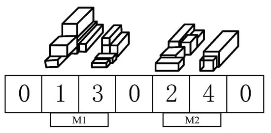 The coding method is integer coding. Assume that the industrial square has four working faces for material delivery, and the initial delivery path code can be [0, 1, 3, 0, 2, 4, 0], as shown in Figure 7. Among them, 0 represents the industrial square, and other numbers represent each working face. According to the constraints of the standard container grouping of the auxiliary transportation robot and the maximum load capacity of the robot, the chromosome is decoded with the natural number 0 to form the corresponding sub-path. It can be seen from Figure 7 that the chromosome can be decoded into two sub-paths of [0, 1, 3, 0] and [0, 2, 4, 0]; that is, the distribution path of robot M1 is as follows: industrial square 0 → working face 1 → working face 3 → industrial square 0. The distribution path of robot M2 is as follows: industrial square 0 → working face 2 → working face 4 → industrial square 0.