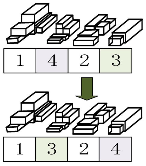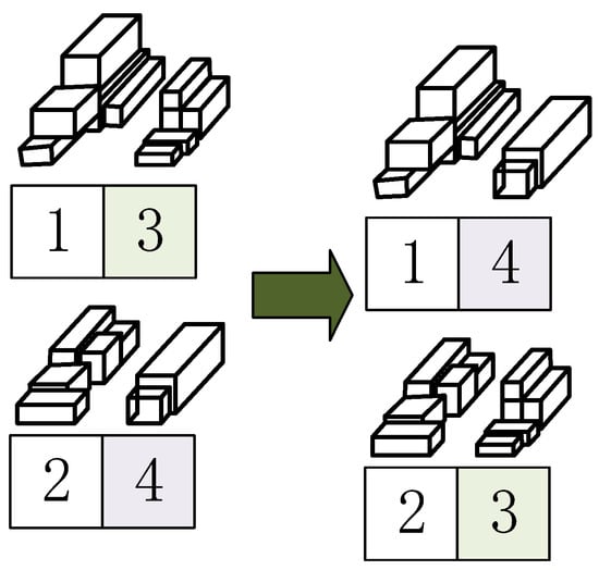 In order to increase the global search ability of the algorithm, the mutation operation is adopted, as shown in Figure 9. The specific implementation method is as follows: according to the mutation probability value Pm, two genes in one chromosome of the parent generation are randomly selected for exchange to generate a new offspring chromosome. After the mutation operation, the distribution scheme corresponding to the robot path should meet the relevant constraints. If not, the mutation operation should be carried out again.