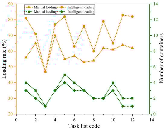 Statistical manual loading results are shown in Table 6. The performance diagrams of different loading modes are drawn according to the loading results, as shown in Figure 11. The manual loading results of a single-container task list are less, the multi-container task list standard container maximum space utilization difference is small, and, overall, they are full of subjectivity. Comparing the two loading methods, from the perspective of the maximum space utilization rate of the standard container, the average space utilization rate of the maximum space utilization rate of the manual loading standard container is 59%, the average space utilization rate of the maximum space utilization rate of the intelligent loading standard container is 72%, and the intelligent loading is 18% higher than the average space utilization rate of the manual loading. From the number of standard containers, 12 task lists are manually loaded using 35 standard containers, and 12 task lists are intelligently loaded using 28 standard containers. Intelligent loading reduces the use of standard containers by 20% compared with manual loading. In general, intelligent loading has better performance than manual loading.