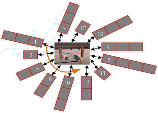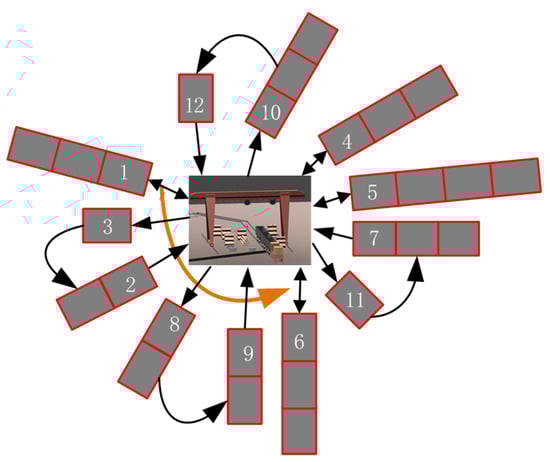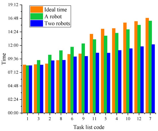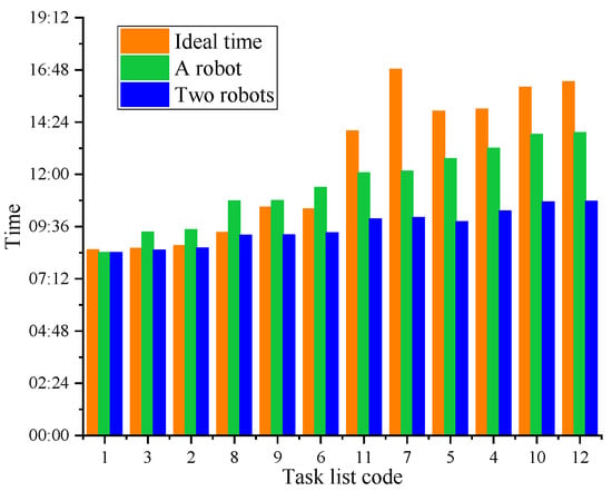 The electric locomotive robot is grouped into 4 groups with a maximum load of 20 t. The electric locomotive is manually scheduled to be loaded and dispatched according to the task list. If the task list material is within the carrying range of the electric locomotive, the task list is distributed by an electric locomotive. If the task list material is larger than the carrying range of the electric locomotive, the electric locomotive will carry out multiple distributions. The electric locomotive that distributes the task list does not accept the distribution of other task list materials. Under this delivery rule, the scheduling scheme is shown in Table 7, and the path planning is shown in Figure 12. The yellow arrows represent the delivery task list, which is in the task list of (0,1,0), (0,3,0), (0,2,0), (0,8,0), (0,8,0), (0,9,0), (0,11,0), (0,5,0), (0,4,0), (0,10,0), (0,12,0), (0,7,0). If there is only one electric locomotive robot on site, the total delivery distance under manual scheduling is 31,178.01 m, regardless of loading and unloading time. There are five delivery delay task lists (task list two, task list three, task list eight, task list six, and task list nine), as shown in Figure 13. The delay time is 15,772 s; if there are two electric locomotive robots available on site, regardless of the loading and unloading time, the number of delivery delay task lists is two (task list 2 and task list 8), and the delay time is 2088 s.