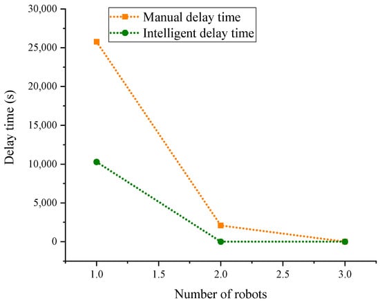 The standard genetic algorithm optimizes the shortest delivery distance of 20,680.63 m, with a total of 8 deliveries. The NSGA-II algorithm is used to solve the problem. The result is that 2 transport robots are needed, all task lists are not delayed, and the delay time is reduced by 100%. When the intelligent algorithm is used for robot scheduling, the path planning is shown in Figure 14. The yellow arrows represent the delivery task list, which is (0,1,0), (0,3,2,0), (0,8,9,0), (0,6,0), (0,11,7,0), (0,5,0), (0,4,0), and (0,10,10,12,0) on the task list. When a single robot performs delivery, as shown in Figure 15, there are 5 delivery delay task lists (task list 2, task list 3, task list 8, task list 6, task list 9), and the delay time is 15,194 s. Compared with manual scheduling, the delay time is reduced by 3.7%. According to the calculated data, the relationship between the delay time and the number of robots under different scheduling modes is drawn (Figure 16). It can be seen from the Figure that under the same delay condition, more robots are needed to complete the task list manually; when the number of robots is the same, manual scheduling takes longer to complete the task list.