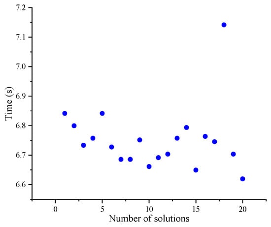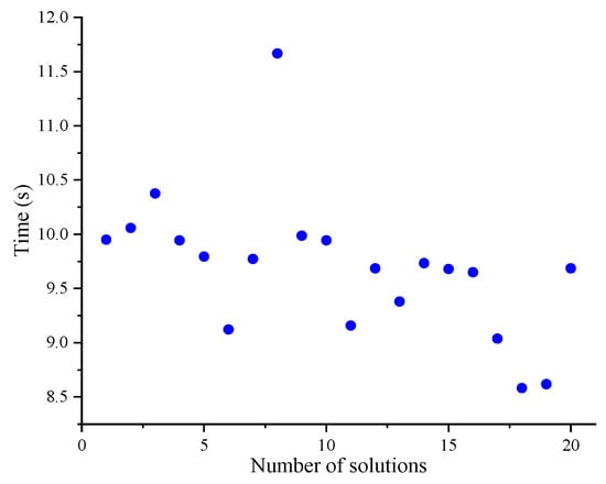 In the actual scheduling application, because the task list information is constantly updated and the real-time performance is strong, the scheduling scheme is also constantly updated and transformed. In the solution process, the accuracy of the scheduling scheme is at the expense of the solution time. The solution time is an important index that affects the engineering application of the algorithm. We hope that the process of obtaining the scheduling scheme is fast and efficient. Statistics dual-layer genetic algorithm to solve the time 20 times, draw a scatter diagram as shown in Figure 17, can be seen from the Figure, the solution time is more evenly distributed in the vicinity of 10 s, take the average of 9.7 s.