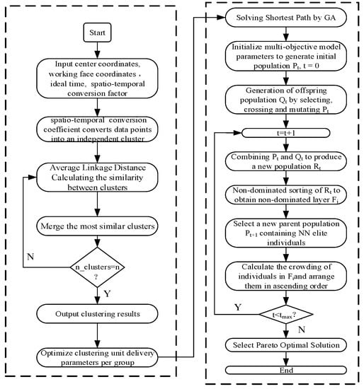 The overall process of intelligent scheduling strategy based on hierarchical clustering dual-layer genetic algorithm is shown in Figure 19. First, input the initial parameters of the distribution, including the distribution center coordinates, working face coordinates, expected delivery time, and spatiotemporal conversion coefficient; then, the data are normalized by using the spatiotemporal conversion coefficient, and the spatial two-dimensional coordinates and the time one-dimensional coordinates are regarded as three-dimensional data points. Each data point is an independent cluster; finally, the Average Linkage formula is used to calculate the similarity between clusters, and the clusters with the highest similarity are merged until the cluster category is consistent with the set parameter n, and the clustering result is output. The distribution parameters are optimized inside the clustering unit. Firstly, the basic genetic algorithm is used to solve the shortest path inside the unit. Then, the NSGA-II framework is used to solve the minimum robot and the shortest delay time dual-objective model, and the population Pt is initialized. The selection, crossover, and mutation operations are performed on Pt to generate the offspring population Qt. The Pt and Qt are merged to generate a new population Rt. The non-dominated sorting is performed on Rt to obtain the non-dominated layer Fi. The new parent population Pt+1 containing NN elite individuals is selected to calculate the crowding degree of individuals in Fi and arrange them in ascending order. Finally, when the number of iterations reaches the set value, the Pareto optimal solution is selected. Output delivery path parameters.
