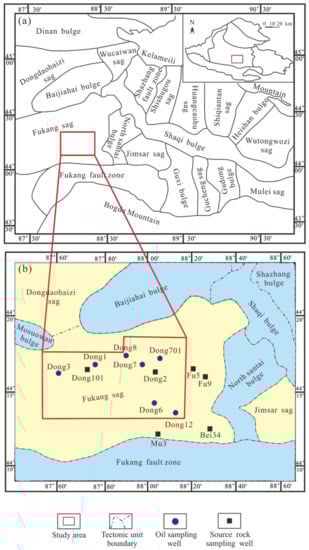 Junggar Basin is an inland basin located in North Tianshan Mountain, sandwiched between Zaire, Qinggelidi Mountain, and Kelameili Mountain [,]. Fukang Sag extends along 44°10′–44°30′ N and 87°30′–88°40′ E, belonging to the Changji Hui Autonomous Prefecture (Figure 1a). In terms of its structural position, it belongs to the slope belt of the central depression, which is adjacent to the Baijiahai bulge and the Fukang fault zone. [,,,] (Figure 1b). The target layer is deeply buried, and the structural form is relatively simple, but the structural evolution and burial history are relatively complex.