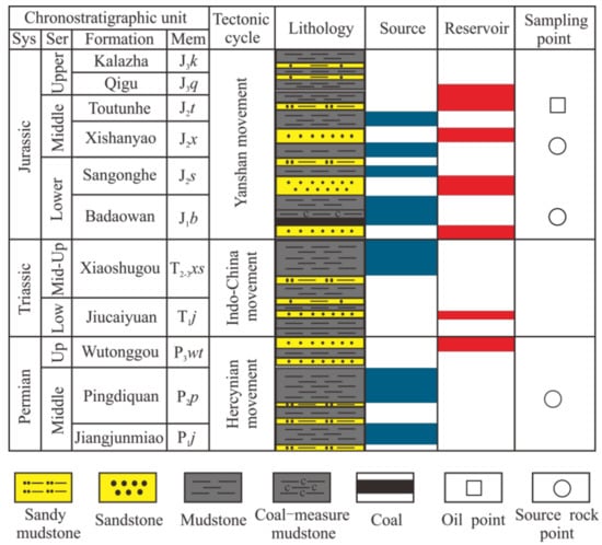 The Jurassic system can be further divided into the Lower Jurassic Badaowan Formation and the Sangonghe Formation, the Middle Jurassic Xishanyao Formation and Toutunhe Formation, and the Upper Jurassic Qigu Formation and Kalazha Formation. The main exploration targets of the study block are the Badaowan Formation and the Xishanyao Formation of the Jurassic System []. In addition, the Badaowan Formation is a coal-bearing formation, and the middle part is coal-measure mudstone mixed with thin coal. The Xishanyao Formation is a lacustrine coal measure stratum, which is mainly interbedded with mudstone and sandstone and interbedded with gray–black carbonaceous mudstone (Figure 2).
