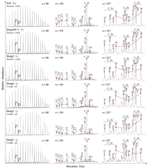 The extracts of the Dong1 and Dong3 crude oil had relatively high C19+20/C19+20+21+23 values, which were 0.62–0.70 (avg. 0.65). Moreover, they had the highest Pr/Ph ratio of any crude, ranging from 2.95 to 3.05 (avg. 3.00), which showed pristane predominance (Table 1). The obvious C24 tetracyclic terpane advantage resulted in C24TeT/C26TT ratios, which ranged from 3.50 to 4.60 (avg. 4.05). The Dong7, Dong701, and Dong8 crude oil C19+20/C19+20+21+23 ratios were relatively low and varied from 0.44 to 0.53 (avg. 0.48). The ratio values of the Pr/Ph were distributed from 2.05 to 2.34, with an average of 2.16, which showed a distinct pristane advantage. The ratios of the C24TeT/C26TT were slightly lower than that of the former, which were mainly distributed between 2.1 to 2.8 (avg. 2.44). Significantly different from the previous crude oil, the C19+20/C19+20+21+23 ratios, Pr/Ph ratios, and C24TeT/C26TT ratios of the Dong 6 and Dong 12 were the lowest, and their distribution ranges were 0.33–0.38 (avg. 0.36), 1.80–1.89 (avg. 1.85), and 1.53–1.81 (avg. 1.69), respectively.